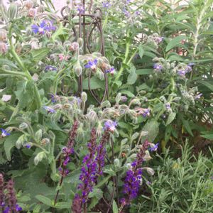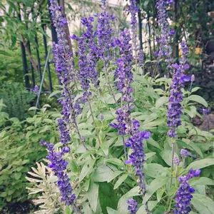 おはようございます☀ 我が家の小さなブルーガーデン🌱 サルビアレウカンサ✨ 濃い紫の花とシックな緑の葉🌱 右側はイングリッシュラベンダー 真ん中は、ポリジ✨ 綺麗な水色の花 雨で倒れ気味です。 1番奥はアメジストセージ これから暴れてくれるでしょう😅