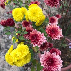 マム💛🧡💚コレクション🤣 なんだか😂集めてしまってる〜 ダンテシリーズ5色MIXなはずが4色しか咲いてない〜😢黄赤ピンポンマムはこの前、半額でゲット🤣グリーンもやっと咲いてきました💚