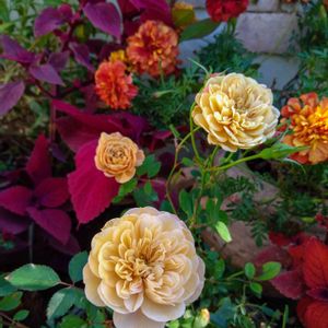この秋の花数は少なかったけれど、覆輪の色が美しく出てくれたカルーセル・コルダーナです(右上)。 房咲きのスイートチャリオットとともに。