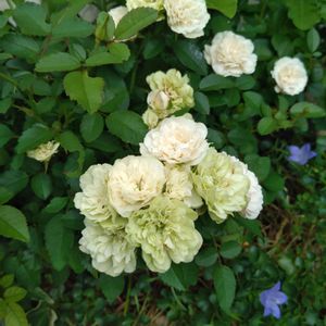 ミニバラのグリーンアイスとカンパニュラメリーベルです。 グリーンアイスは暑いのに花付きが良くて、病気にも強いしお気に入りです😍 メリーベルは去年から育ててるけどワサワサ茂るばっかりで満開になったことがないからちょっと悲しいです😢