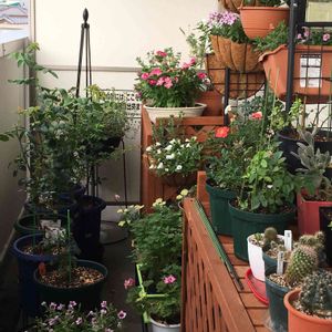 我が家のバルコニーの反対側です😅みんなスーパーの買い物ついでに連れて帰った子です😅エアコンの効いた涼し過ぎる店内の狭いお花コーナーで乾いてチリチリになってましたー😅1番左のミニバラは¥50でしたわー😀 咲いて見ないと何色なのか分からないですねー😅 バーベナのピンクも頑張って欲しいわー🤗