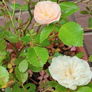 ミニバラの スイートチャリオット💜です。 もう少しで満開かな? 左の白い花は ミニバラの グリーンアイスです💚 こちらはまだ開花が進んでいません。