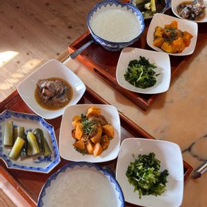 朝ごはん 白粥、塩 秋刀魚旨煮 糠味噌漬け キューリ 大根葉塩揉み 柿、小葱、胡麻醤油和え