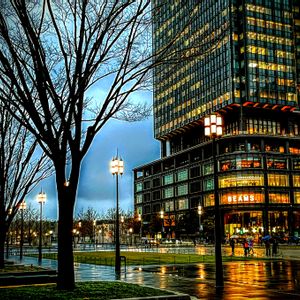 小雨が路面を濡らし ビルの灯りを映し出す 樹木が、ユトリロの作品風にみえる夕暮れどき この時間帯の東京駅周辺には、いつも風情を感じる