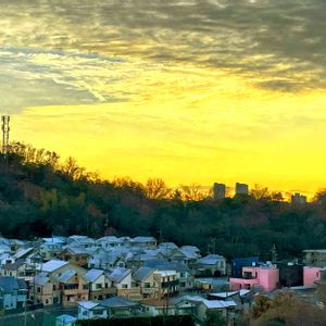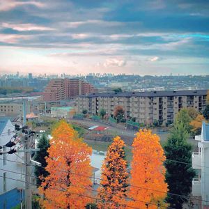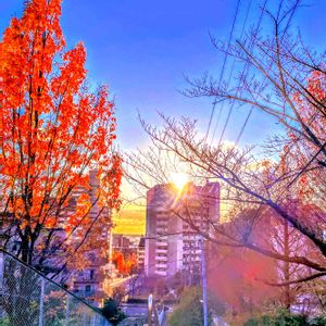 夕暮れの光にあかく染まる雲 一気の冷え込みに 樹木の赤い色も呼応するかのように映える