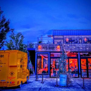 夕暮れ時 公園のカフェを横目にみて通り過ぎていく