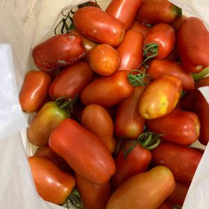本日の収穫、調理用トマトたち。 サンマルツァーノのサイズが小さくなってきましたが、5kg以上採れました…。 大玉近いサイズのボンジョールノも採れ始めています。
