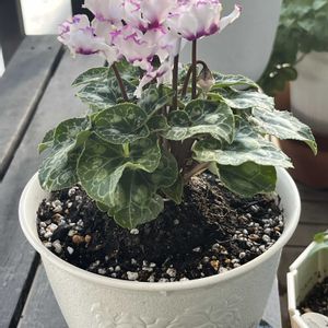 こんにちは✨ いい天気になりました☺️ 1️⃣このまえ園芸店で買ってきた🤍名もなきガーデンシクラメン🎵可愛い💗 2️⃣パンジービーコン2株とハツユキカズラをプランターに植えました😆