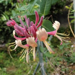 秋彩(あきいろ) スイカズラ(ハニーサックル) 和名(吸葛)スイカズラ科です、 4月〜5月開花となってるのに 今、咲いてました、良いのかな? やっぱ、狂い咲きだよね、 朝の散歩中に出会いました、