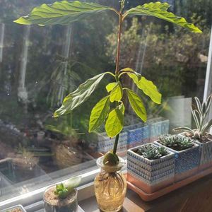 すくすくと成長しているアボカド。もうすぐ根がグラスにパンパンになりそう😅 盆栽風に育てたくて短く切る予定です😬