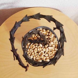 セロペギア ボッセリを神龍のように仕立ててみました🐉光と逆方向に育つらしいので色々向きを調整しています。洒落でじっちゃんの形見の四星球を乗せてみました^_^ 鉢は、100均の焼酎グラスに底穴をあけて使用しました👌