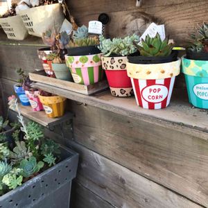 木工市に行きました😚 はしご型の棚♡ サボテンの絵がいっぱいの鉢♡ 「ご自由にお持ち帰りください」のアロエ♡ お庭に仲間が増えました (*ˊ艸ˋ)♬*