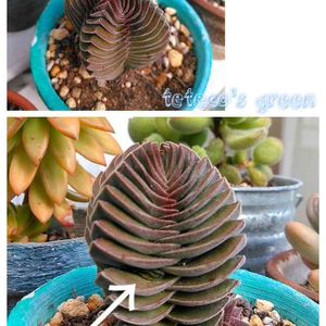 クラッスラーズ ↘️巴:硬いお皿みたいな葉っぱでクラッスラに見えなくなくない感じの子。 ↙️紀ノ川:硬くて肉厚、夏の暑さも ものともせず安定感がある子。 ↗️キムナッキー:保険で2つ居たうちのあっちの子。こっちの子は...水切りしてたけど、秋を見ることはありませんでした。色は煤けて、どうしたら良いのか全く解らず気難しい子。 ↖️玉稚児:以前picに挙げていましたが、久し振りの登場。多少家族も増えましたが、見事に徒長してくれて身長は伸びました。 ⬆️山積パンケーキ:特大サイズで5枚重ねの生クリームかアイス、苺などソースも滴る位かかった佐世保バーガーよりでかいんじゃねっていう危険な子。
