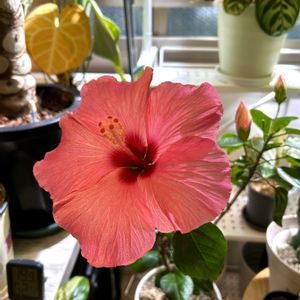 今日のハイビスカス🌺ロングライフシリーズアドニス😊かわいい🩷です〜😊葉っぱは寒さで黄色くなり始めてますが、まだまだ元気に咲いてくれてます😊インドアハイビスカスサニーシティーも赤いつぼみが膨らんできました😊