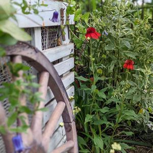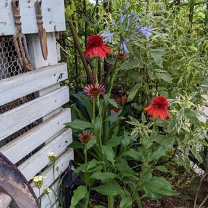 5. 撮り貯めシリーズ:6月中旬 ナチュラルガーデン 自作室外機カバー 手前から撮影 1. 紫:クレマチス ロウグチ 今年買い足した。只今根を張らせるためルーツポーチに植え中。グレーはそのまま土中へ植えると自然に分解される 2. 黃 :ダイアンサス イエローハーモニー 色と可愛らしい花姿に惹かれ、買い物カゴに… 3. 赤:エキナセア エキセントリック 今まで赤は…と敬遠していたが今年は何故か赤に惹かれ・目覚めか!?、寄せ植えでも多様。特に花姿と名前が気に入って、気付くと買い物カゴに… 4. 見えづらいが水色:アガパンサス 当初ここには大グラスが植わっていたが、モッコウバラ白が多く咲き、軽いオープンガーデンした時に観に来てくれた方が、家にあるからと株分けしてくれたのでグラスを抜き植えた。強いようですぐに根付き咲いた。 「こういったよく見えない場所に一手間かける・どうするかは大切と考えている。フェンス&モッコウの上や隙間から斑入りの葉や背の高い花が透けて見える感じ」 5. 白斑入り葉:フジバカマ 現在小さなピンクの花蕾が付いて超カワイイ。旺盛だがアガパンサスも旺盛で影響を受けてしまわないか少し不安 6. フェンスに誘引しているのがモッコウバラ白:白は甘い香りがする このスペースは日当たりも良いので、花草を充実させていく予定。今まで寄せ植えで使うような花苗を地植えする考えはなかったが、寄せ植えではあまり良い状態にならず植え替えた花をこの場所に植えたら大きくなり再開花したので利用する予定 ※寄せ植えも投稿しているのでよろしかったらどうぞ