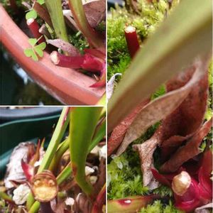 今年はサラセニア レウコフィラ(仮)の花芽が中々上がって来ないな~と思ってたんですが、あまりにも遅いので株元を探してみると····( ̄□ ̄;)!! くっ···首が··切られてる···頭が半分噛られてるのもある····。 今まで一度も花芽を噛られたことなんて無かったのに。 結局、11個噛られて、無事なのは3つしか残ってないですが、例年花芽を間引きそびれて全部咲かせてしまってるので、まっ、いいか。でも、誰が噛ったんだろ(・・?