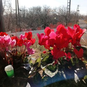 職場のキッチンフラワー♥️雨が降ったり、止んだりの変な天気の中、又シクラメンの赤の大きいのを、買いに出かけました♥️