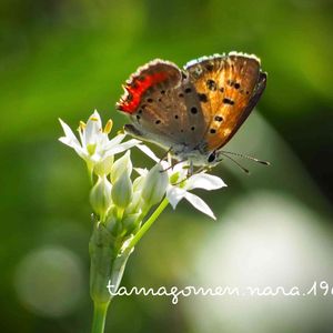 韮と紅小灰蝶 光で透ける羽根が少し傷んでいる もしかしたら、 何度か襲われそうになったけれど ここまで生き残ってきた子なのかもと思う。 生き抜くって大変。(˘ω˘)𓈒𓂂◌𓂂𓏸