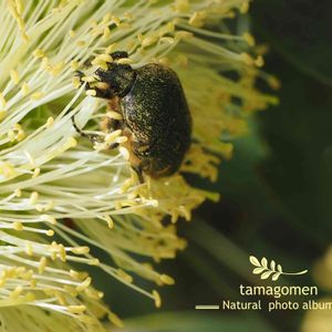 槙葉刷子の木とコアオハナムグリ 一心不乱にお食事中のコアオハナムグリ 蝶々と違って堂々としています (笑) 食事に夢中なので触っても逃げるなんて事も ないんだから堂々としたもんです。ꉂꉂ(ᵔᗜᵔ*)笑笑