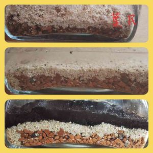 昨日の続き😒 上は昨日から乾燥させた状態。 中は水を入れて、砂をならしました。 下は、黒土を入れて霧吹きでならしています。 底石と砂、用土の境が綺麗に仕上げのがコツですね😃 只今、作成中❗️ 作成者 葉民 監 修 なおきさん