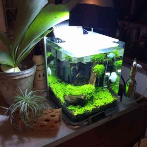 ミスト式で栽培中のキューバパールグラスの岩組み水槽。ライトが弱いせいか、ここまで来るのに3ヶ月以上かかってしまい、藍藻やら他のコケも繁茂してしまっている。藍藻はともかく他のコケは注水すればなんとかなる…か? キューバパールグラスが、岩を少し匍匐して登っていく様はいい感じ。 ちなみにミスト式というのは、水草を育てるやり方の一つで、底床に水草を植え込んで、水は入れずに霧吹きだけしてラップで密閉し、ライトを当てて育て、最後に注水するという方法です。水中で育てるよりも短期に育成できるはずなんですが😁