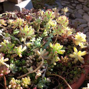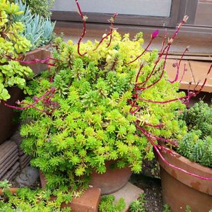 庭先のセダムたち。 鉢からあふれてくきをのばしているのは、土に落ちてそこで根を張ります。 強いなあ。