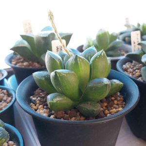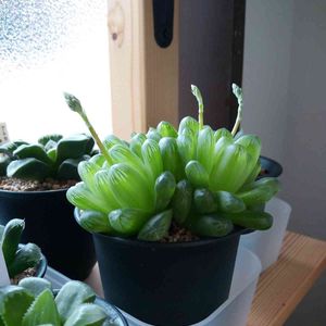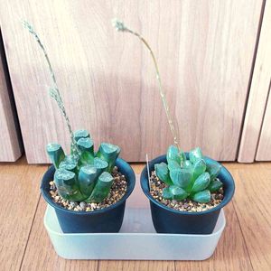 ハオルチア 万象と緑焰。 緑焰の花芽があがって来たが、他に花芽のあがっている株がなかったので、ちょっとズルして花芽のついた万象を購入。 どうしても交配をしてみたくて😅 上手く花が合ってくれればいいですが。 緑焰は他のハオルチアと花の形が少し違うそうなので、交配は難しそうです。 まあ、咲いてからのお楽しみですね。