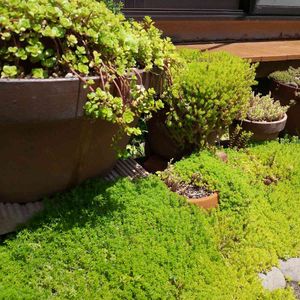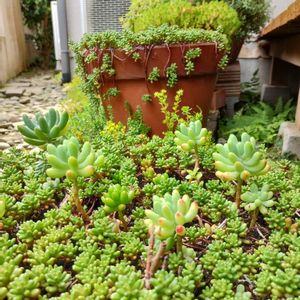 セダムたちが鉢から溢れて繁茂中。 このまま家ごと飲み込まれて、セダム屋敷が出来上がるかも!? それはそれで楽しいね。