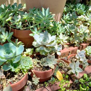 庭先。 エケベリアとセダムと、グラプトペタルムと、その他たくさん。 暑さにマケズ、つよい子たち。