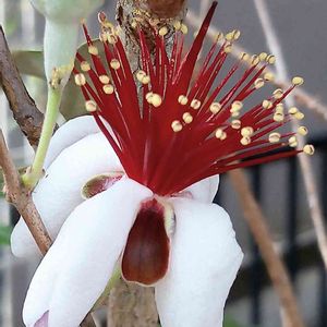 フェイジョアに、はじめて花が咲きました! 赤と白のコントラストが鮮やかな花です。 この花、食べられるそうですが…、我慢、我慢。 果実ができたら食べようと思います😁