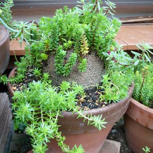 途中経過3 土団子のセダム鉢。 長雨にもマケズ、元気に成長中。 目論見通り、山のようにモサモサしてきました。 かなり暴れてますが、実験成功か? コレ、4種類植えてありますが、1種類だけでやったらきれいな山ができるかもしれませんね。