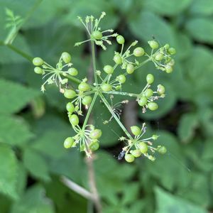 日陰三つ葉 ヒカゲミツバ セリ科 カノツメソウ属 分布 関東地方以西、四国、 九州 在来種 花期:8~10月 多年草 ブナ帯の林下に生育する。 白い花が終わり 3mm程の実を付けていました 。小さく艶があります。 ・高さ 30~80cm ・葉 全て2回3出複葉 ・花 白、複散形花序 ・実 3~4mm扁球形、 緑又は 暗紫色、艶があ る。 小さく艶があり複散形の緑色の果実を見つけました。