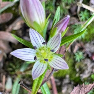 千振 センブリ リンドウ科 センブリ属 分布 北海道 本州 四国 九州 在来種 花期 8〜11月 2年草 ・茎 丈は10-20cm 4稜があり、上部で分枝 する。 ・葉 葉柄は無い。 対生 長さ1.5〜3cmの線形 で全縁 ・花 径1.5cm、白地に紫色 の条線のある合弁花で5深 裂し星状に開く。 3〜5個の花を円錐花序に つける。 ・果実 紡錘形の蒴果 和名は、非常に苦く、千回煎じて(振り出し)ても苦いことから付けられたそう。 もっと高くまで登らないと見つけられないだろうと言われていたが小さな株を2〜3株見つけてちょっと嬉しい。 ユカリさんの 🏷️2025秋の十草 2種目参加