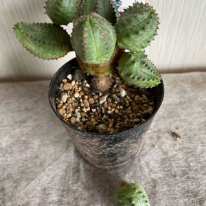 こちら、近所の園芸店でsale価格にて 並んでいた"オベサブロウ" さんです🌱 普段ならスルーするところですが お値段&今後の生長が気になって お迎えすることにした子です🌵 ★2022.1.26 投稿★ ユーフォルビア属の多肉さんは こちらともう一つだけ育てています。 サボテンのような多肉植物。 カッコイイと可愛らしいが混在していて とても興味が湧く品種です☀️ 調べてみると まんまるいフォルムが理想みたいなので とりあえず親株(真ん中)だけ残して あとは外してみました!! 白い汁が出るので、綺麗に洗いながして 子株は土の上に親株はそのままに… するとまんまるい子株が 次々に出てきました! とっても可愛いです⤴︎⤴︎ このまんまるさをキープしたいですね🧡 次はもともとついていた子株の方が どうなったのかご紹介したいと思います♪