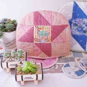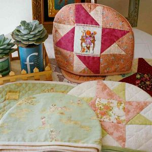 ラウリンゼ、リラシナと 作ったティーコゼ色々☕ パッチワークのは後ろ側は違う色柄で作ったヨ💙