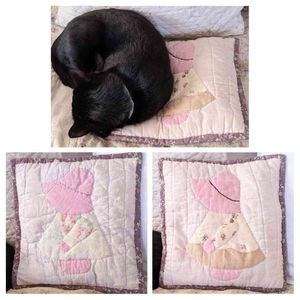 ご無沙汰してました🖐️ お正月明けに車の自損事故で右腕を骨折して、手術とリハビリで11日間入院していました😅 リハビリ兼ねてなるべく右腕を使うようにしています😂 ノワール用にクッション作りました アメリカンビンテージのボンネットスーの古いキルトの切れ端2枚を合わせて、綿を入れて閉じました 服が白無地だったので、可愛い花柄の布でリメイク❣😻