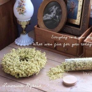 一昨日tikkaさんで作った、スターチス(リモニウム Hyb.)のリース 花の付いた短い小枝をテープで束ねたのを沢山作って、スチロールの輪っかにワイヤーのUピンで止めて行くやり方を教わりました Uピンの先っぽに木工ボンドをつけるんですね 作っている時ポロポロ落ちたのを、瓶に詰めてくれました 小枝がついているのは先っぽにボンドをつけて、隙間に埋めてボリュームを出しました ꒰ෆ❛ั ु▿❛ั ु꒱