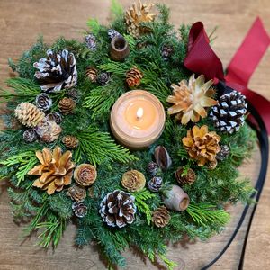 テーブル用のクリスマスリースを作りにフラワーレッスンに参加してきました🎄 実が沢山のナチュラルリース✨ キャンドルを足したら、一気にクリスマス感がアップしました☺️