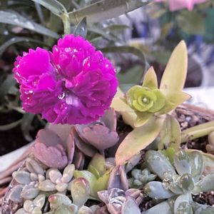 💜今日の推し花…春に咲いたダイアンサス…いつも夏には終わる😅 でも今年は枯れた枝など取り除き カーネーションと木陰に置いて居たら…グリーンの葉っぱ🌿も芽吹き 蕾も持ちジャーン✧\\ ٩( 'ω' )و //✧パープルピンク💜のお花𖤣𖥧𖥣。𖥧𖧧咲いたわ🌸 多肉ちゃんも❤︎スタバカップに 2つ作って、雨☔️に降られながら作りましたꉂꉂ(ᵔᗜᵔ*)𝑇ℎ𝑎𝑛𝑘 𝑦𝑜𝑢*⑅♥