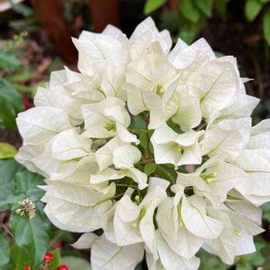 こんにちは〜 白のブーゲンビレアが花束の様に 開いて来ました💖😃 鉢植えなので緑の中に置いてみました🤭 曇り空だけど気持ちいいわ〜♪(*^^)o∀*∀o(^^*)♪💕