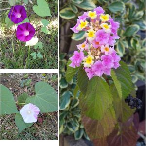 おはようございます~☀️ 今日の一枚です(^_^)v 右:今日のお花「ランタナ」 でももう盛りは過ぎてるよね? ランタナは植えてないからおそらく鳥さんからのプレゼント✨🎁✨ 左は健気に咲くアサガオちゃんズ こぼれダネであちこちから🌱ちゃんが…😅