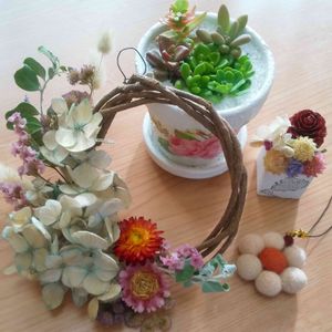 クラフトフェアに行ってきた戦利品です☺️✨ ワークショップでリースは自分好みで作りました🤗(少し手直ししてもらったけど) 多肉ちゃんの寄せ植えもポットも可愛くて、ついお迎えしてしまいましたが、多肉ちゃん上手く育てられるかな😅 いつもお水あげすぎてしまうので…。