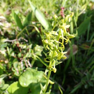 ホソバノキソチドリ 高さ、20㎝くらいでした。 見つけた時、ツレサギソウか、トンボソウかと、ドキドキしました。(①) 調べてみると、高山植物の、 ホソバノキソチドリというお花でした。 花の色は、黄緑色で、茎を触ってみると、太くて硬い感じがしました。 ごちゃごちゃ花がついているので、 どこを写真に撮せばよいのか、わかりません。(②) 近くに寄ってみると、背萼片と、側花弁があって、側萼片と唇弁が見えるかなあ。(③) 距が長いです。そして、下に向いています。(④) 葉は、下のほうに、1枚。卵形のちょっと筋が入った葉でした。 上の方に、線状の葉がついていました。(⑤) 家に帰ってから、写真を図鑑と見比べて悩むこと、数日。 これでもない、これは、違うと、可能性のある植物を消していって、 たどり着いた名前が、ホソバノキソチドリでした。 7.29