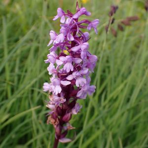 テガタチドリ 高さ20センチくらいの、ピンクがかわいいチドリでした。(②) 背萼片や側花弁が丸っこいです。 目立った模様はなく、唇弁が3裂しています。側萼片が左右に開いています。中の、葯もちょっと見えたかな?(③) 距は細長く後ろに伸びていました。ねじれている花柄子房も、見えました。(①) 葉は、細長くて、茎を抱きます。縦に二つ折りになると、図鑑に書いてあったけど、確かに、縦にすじがある?縁は、縮れていません。(④) ネバリノギランと、一緒の、 テガタチドリ。(⑤) 6月に、ハクサンチドリを弥陀ヶ原で見ましたが、今回、室堂で、テガタチドリに会えて、嬉しかったです。 あとは、どこかで、ノビネチドリに会えると、いいな。 7.29