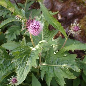 今日のお花、アザミ タテヤマアザミ 立山室堂平のみくりが池が見える道に咲いていました。背の高さは、まだ60センチくらいで、咲き始めでした。 長い柄の先にひとつずつ、花をつけ、下を向いて、咲いていました。(①) 咲いていた花(②) 蕾(③) 葉は、楕円形で、先が尖り、ギザギザと、裂けていました。長細い葉や、幅広の葉も、ありました。(④) みくりが池(⑤) 妙高山系、北アルプス北部、白山山系にしか分布していないそうです。 7.29