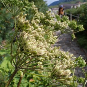 オオハナウド 7月に見た、オオハナウドは、どうなったかな。 種ができていました。(①) 石畳の道の脇にたくさん、咲いていたオオハナウド。 よく見たら、刈り取られていました。背が伸びて、観光客の方々の邪魔になっちゃったんだね。(②) でも、2.3本残っていました。種がたくさんできるから、次の世代に引き継ぐのは、これで十分なのかな? (③) 7月に見た、オオハナウド。まだ、背丈が小さかったです。(④) 外側の花弁が大きい。中の花との大きさが違うのに、びっくりしました。(⑤) 違う場所では、種が枯れて飛んでいってしまった株もありました。 室堂平は、秋が深まっているなあと感じました。 ①②③ 8.19 ④⑤ 7.29