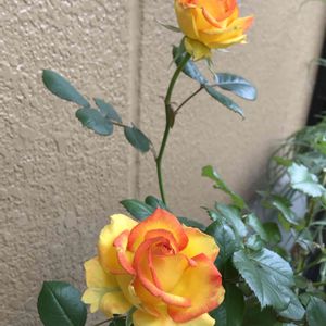 🌹ばら 名前不詳 玄関脇 薄暗い朝です。最初に咲いた4輪が終わり残り2輪が開花🌼🌼