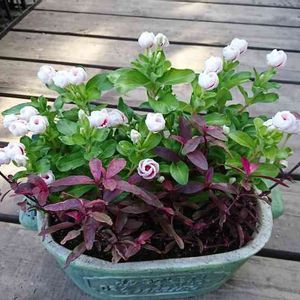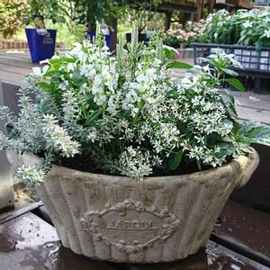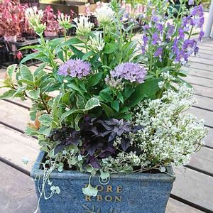 今度こそ涼しげな寄せ植え(笑)? 前回の涼しくない寄せ植えからのリベンジで、今度こそ涼しげなブルー&ホワイトの寄せ植え。 暑い時期ですが、夏に強い植物達で寄せ植えしています。 結構ボリュームありますが、植え位置や使用する用土の工夫で、暑い夏もノープレブレムです! ちなみに寄せ植えには、いつも当店オリジナル培養土を使用しております! 今日もかなりの暑さですが、花を見て少しでも涼しさを感じてもらえれば嬉しいです! 使用した植物は、 栄養系アンゲロニア“ウェッジウッドブルー”、ペンタス“グラフィティ・ホワイト”、栄養系矮性ブルーペンタス“シリウス”、斑入りヤブコウジ、八重咲きユーフォルビア“ダイアモンドスター”、トウガラシ“パープルフラッシュ”、ディコンドラ“シルバーフォール”です。 @ ホピー鈴蘭園