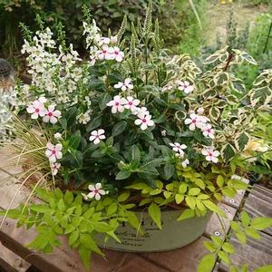 ブーケの様に花盛りの豪華な寄せ植え 暑い夏にも丈夫な植物で達で寄せ植えしました。 ライトピンクの花色を中心に女性目線で作ってみました。 寄せ植えの主役には、奈良県の大人気生産農家北島園芸さんのフリンジ咲きビンカを2品種使用。 写真を見て左と右のビンカの違いがわかる方はかなりの北島園芸ファンですね! 柔らかい花色とグリーンのブリキ鉢が良い感じです。 暑い夏に何となく可愛らしさと涼しさを感じてもらえれば嬉しいです! 使用した植物は、 北島園芸オリジナルビンカ“さくらホイップチュチュ(写真左)”・“フェアリーチークチュチュ(写真右)”、アンゲロニア“セレニータ”、ペンタス“グラフィティ”、斑入りヤブコウジ、ディコンドラ“シルバーフォール”です。 #夢と緑を運ぶ店ホピー#有限会社鈴蘭園#神戸市北区園芸店#ガーデニング#花屋#花のある暮らし#植物のある暮らし#寄せ植え#当店お勧め植物#奈良県北島園芸#フリンジ咲きビンカ#さくらホイップチュチュ#フェアリーチークチュチュ#アンゲロニア#セレニータ#ペンタス#グラフィティ#斑入りヤブコウジ#ディコンドラ#シルバーフォール#女性目線#可愛らしさと涼しさ#ブーケの様に @ ホピー鈴蘭園