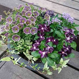 まとまって無い様で、まとまっている寄せ植え(笑) スタイリッシュなライトグレーのグラスファイバーの植木鉢に、暑い夏にピッタリなブルーカラーの花色で涼しげな寄せ植えを作ったつもりが、全く涼しくない(笑)。 今年の新品種も盛り込んで作ったので、素材は良いはずなのに、何かまとまりが無い寄せ植えになってしまいました(笑)。 まぁ全体のカラートーンは合ってるかなとも思うのでまぁまとまっている事にしましょう! こんな組み合わせもたまには良いかな? お好きな人は「いいねボタン」よろしくお願い致します(笑)!! 使用した植物は、 栄養系ペチュニア“プレミアムコレクション・カプリス”、ビンカ“藍染め絞り”、栄養系矮性ブルーペンタス“シリウス”、ヘデラ“白雪姫・雪の華”、トウガラシ“パープルフラッシュ”です。 #夢と緑を運ぶ店ホピー#有限会社鈴蘭園#神戸市北区園芸店#ガーデニング#花屋#花のある暮らし#植物のある暮らし#寄せ植え#ブルーカラー#涼しげなつもりか全く涼しくない#カラートーンは多分合っている @ ホピー鈴蘭園
